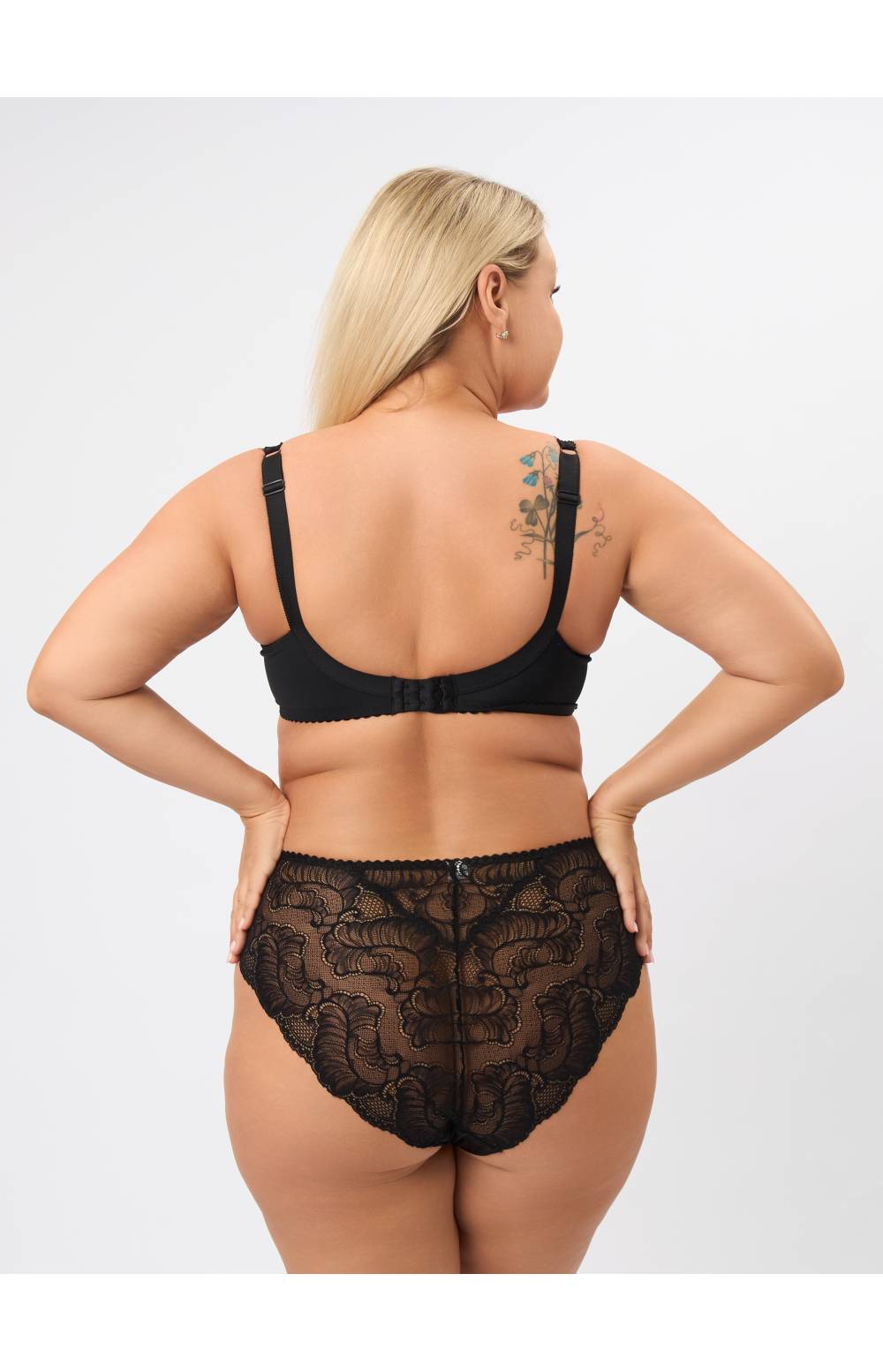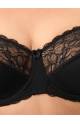 Чашки с боковой корректирующей деталью собирают грудь с боков и направляют ее к центру. Диагональный шов центрирует грудь. Бретели отделаны кружевом.